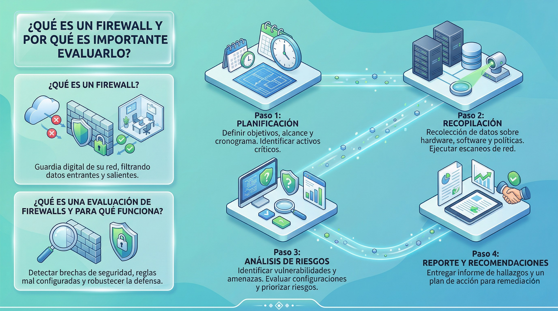 Tu firewall es el escudo que separa tu empresa del caos de internet, pero un escudo con grietas no cumple su función. Invertir en evaluar su estado real te otorga el control total sobre tus conexiones y la tranquilidad de saber que tu operación es sólida y resistente ante ataques externos.